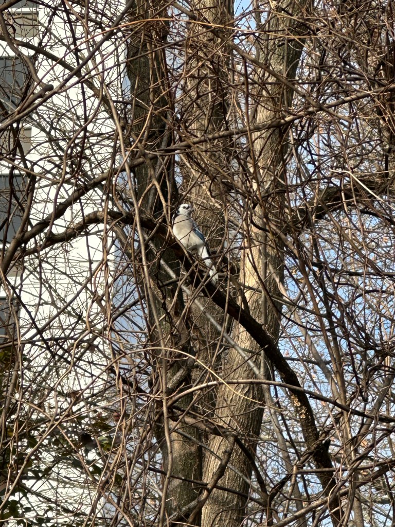 A few days later, while taking my dog Ina on our morning walk in the park right across from our apartment, a blue jay flew across and perched on a tree branch. As I was documenting it, another one appeared. Two blue jays at once–I was mesmerized.